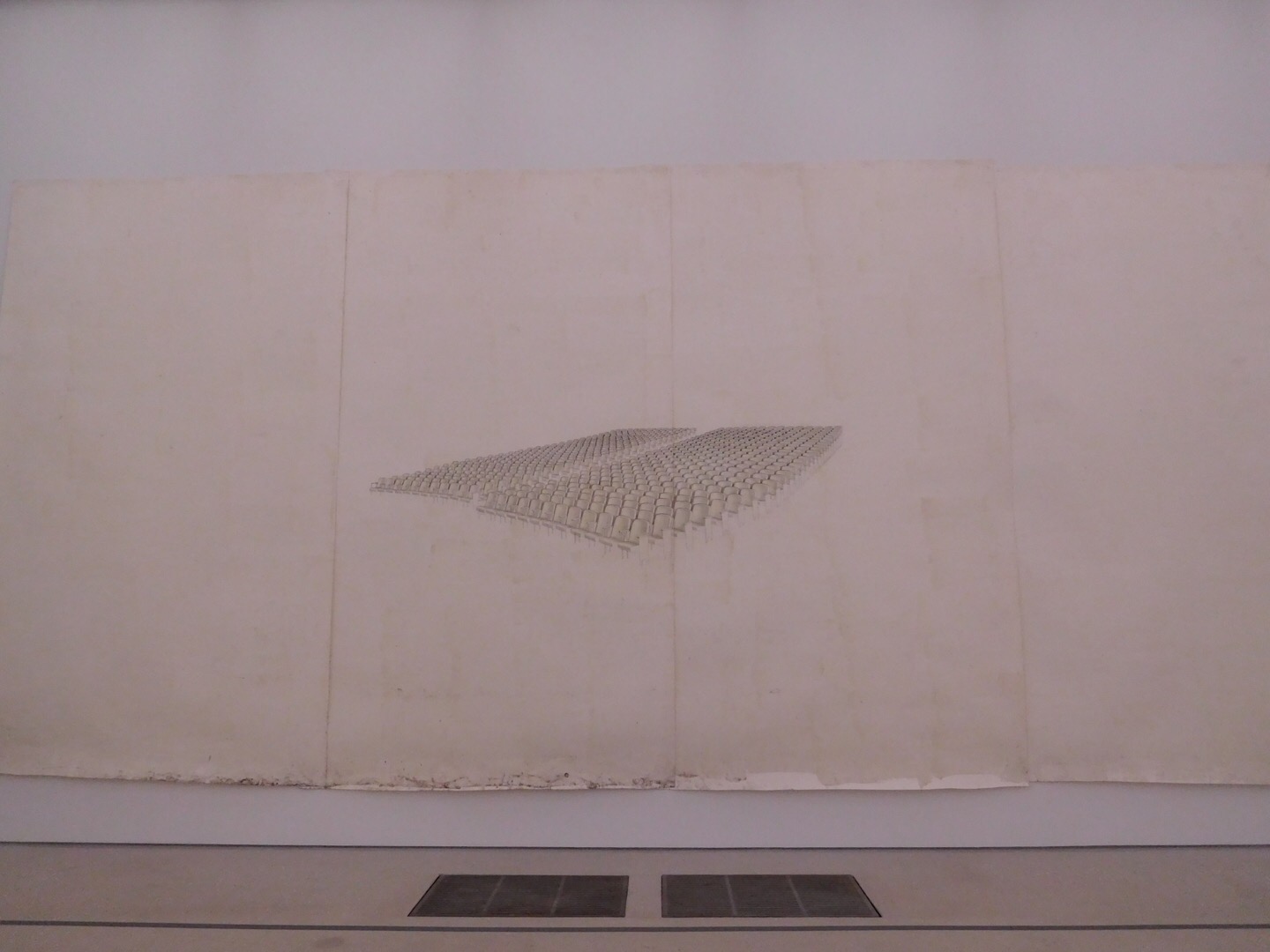 Dann die dargestellten Motive: eigentlich Alltägliches, wie Türen, Fenster, Treppen, Stühle, Feuerstellen, Mauern, … groß auf die noch größeren Papieruntergründe gemalt. Meistens setzt Khedoori architektonische Formen, perspektivisch mit Fluchtpunkten dargestellt, in die Mitte des Bildes. Rundherum viel weißes Papier. Bei mir entstand dadurch der Eindruck als ob etwas fehlt, das Bild noch nicht fertig ist. Die perspektivisch realitätsnah gemalten Gegenstände sind oft irgendwie herausgerissen aus dem vermeintlichen Umfeld: zum Beispiel Stuhlreihen, die dreidimensional mit Fluchtpunkten dargestellt weden, ohne dabei auf einem Boden zu stehen oder sonst irgendwie in einen Raum eingefasst zu sein. Der Raum ist das großformatige Papier.