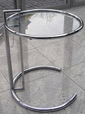 Diese Klassiker sind Entwürfe für ihr erstes Haus. Jean Badovici hatte die Autodidaktin in ihrer Idee bestärkt, ein Haus zu entwerfen und einzurichten. In Zusammenarbeit mit Jean Badovici entsteht zwischen 1926 und 1929 die Villa E-1027 in Roquebrune an der französischen Riviera. (Der Name des Hauses ist ein Zahlenspiel – er fügt zur persönlichen Identifikation der Autoren deren Initiale des Namens über einen Zahlenschlüssel des Alphabets zusammen: E=Eileen, 10=Jean, 2=Badovici, 7=Gray.) Eileen Gray entwirft innovative Einbaumöbel für das L-förmige Flachdachgebäude und multifunktionale Einzelmöbel aus Stahlrohr, beispielsweise eben den – oben gezeigten – Beistelltisch E-1027.